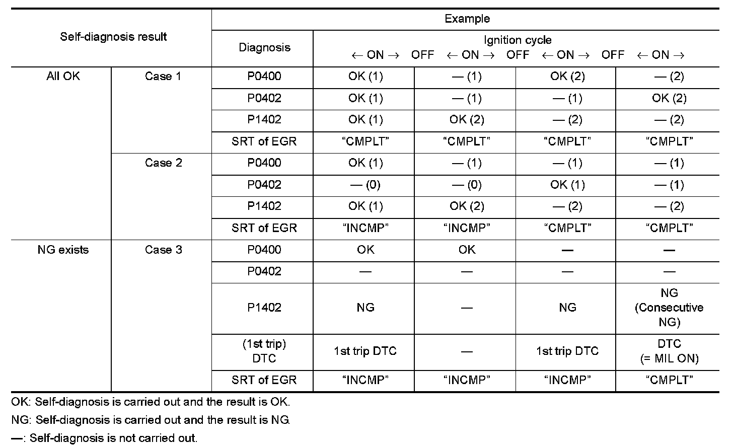 When all SRT related self-diagnoses show OK results in a single cycle (Ignition OFF-ON-OFF), the SRT will indicate "CMPLT". --> Case 1 above