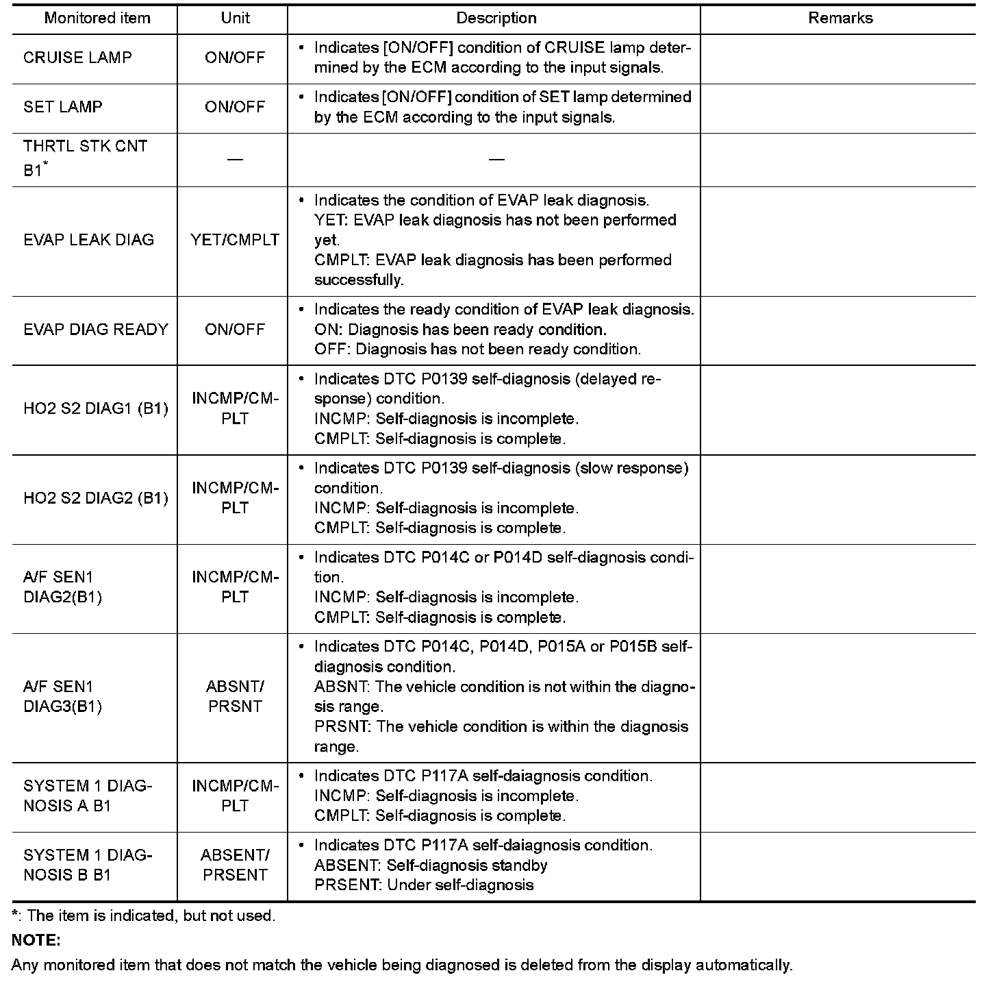 - For items whose SRT codes are set, "CMPLT" is displayed on the CONSULT screen; for items whose SRT