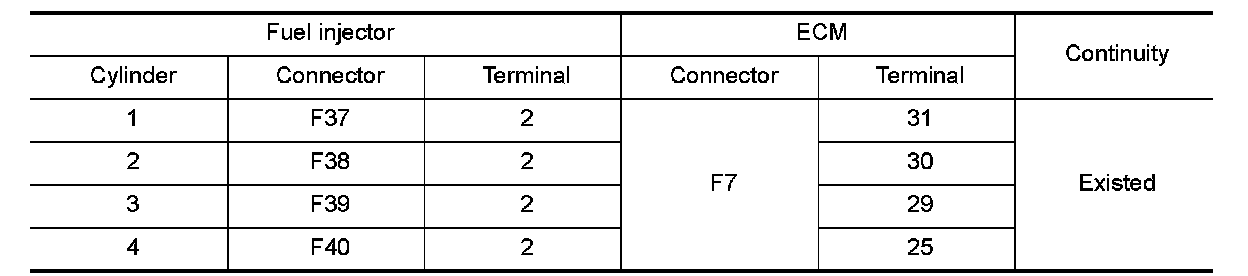 3.Check the continuity between fuel injector harness connector and ECM harness connector.