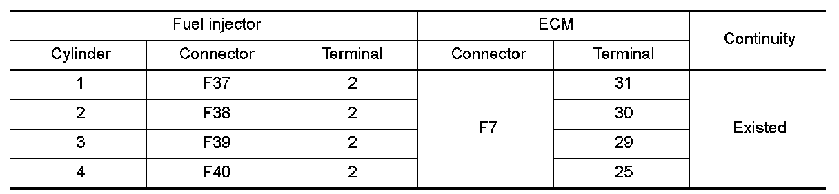 3.Check the continuity between fuel injector harness connector and ECM harness connector.