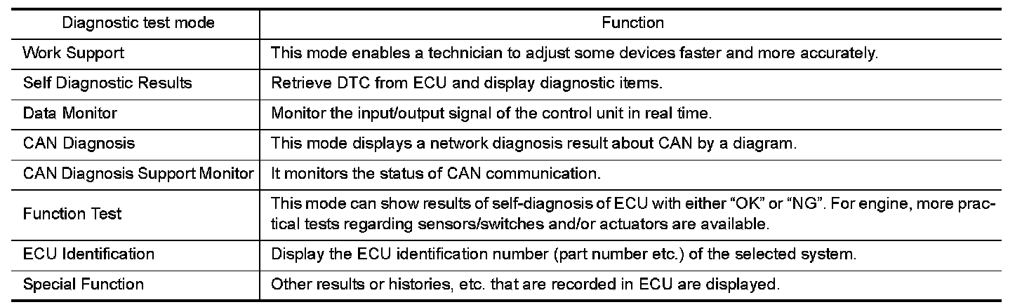 CONSULT can display each diagnostic item using the diagnostic test modes shown following.