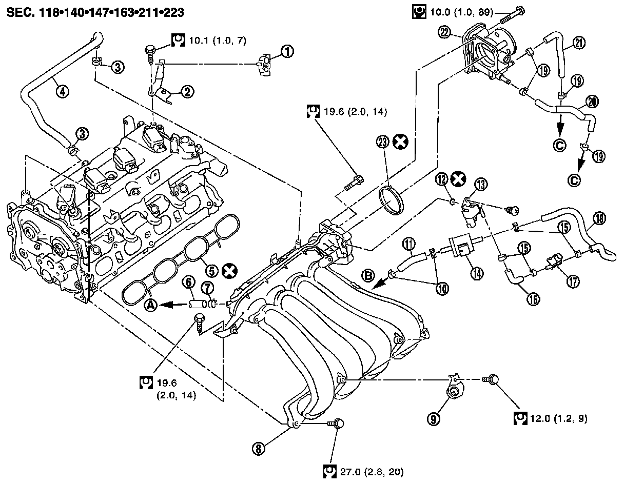c.Tighten intake manifold mounting bolt (A). Then tighten intake manifold mounting bolt (B).