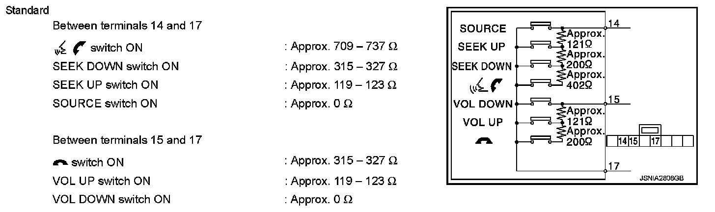 Measure the resistance between the steering switch connector terminals 14 to 17 and 15 to 17.