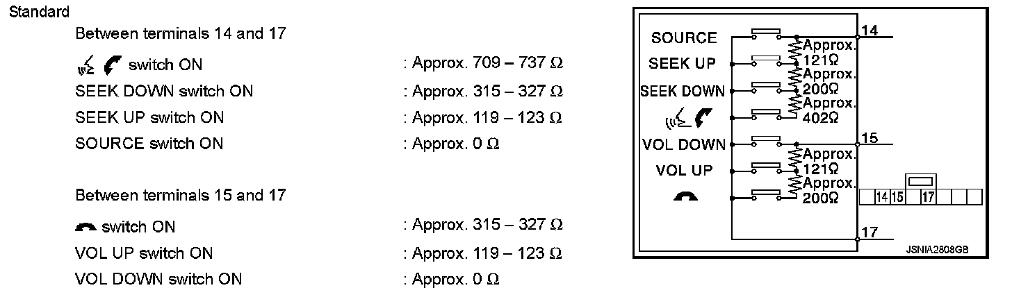 Measure the resistance between the steering switch connector terminals 14 to 17 and 15 to 17.