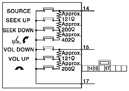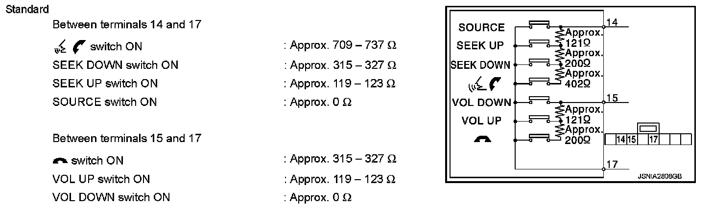 Measure the resistance between the steering switch connector terminals 14 to 17 and 15 to 17.