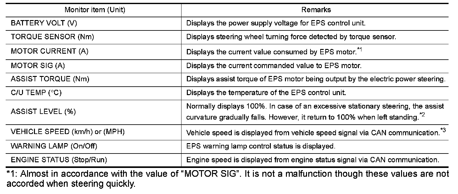 *1: Almost in accordance with the value of "MOTOR SIG". It is not a malfunction though these values are not accorded when steering quickly.