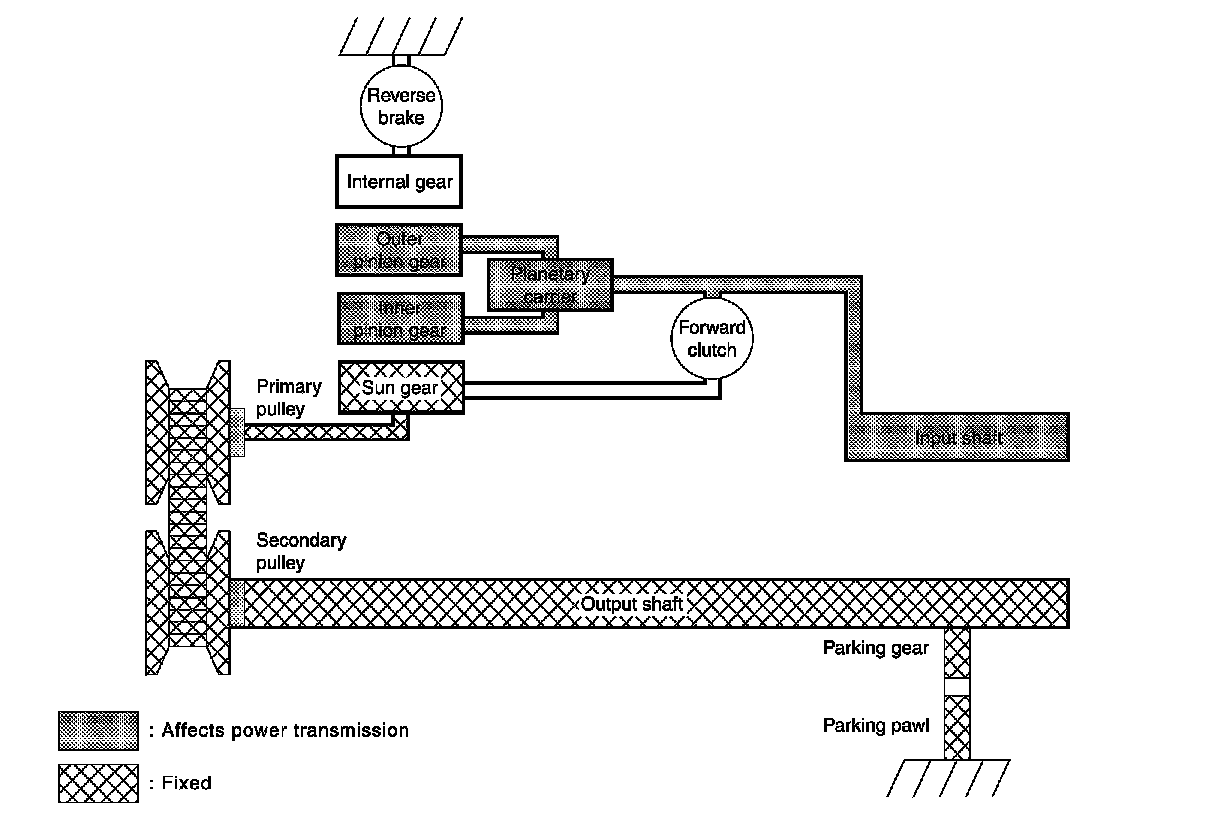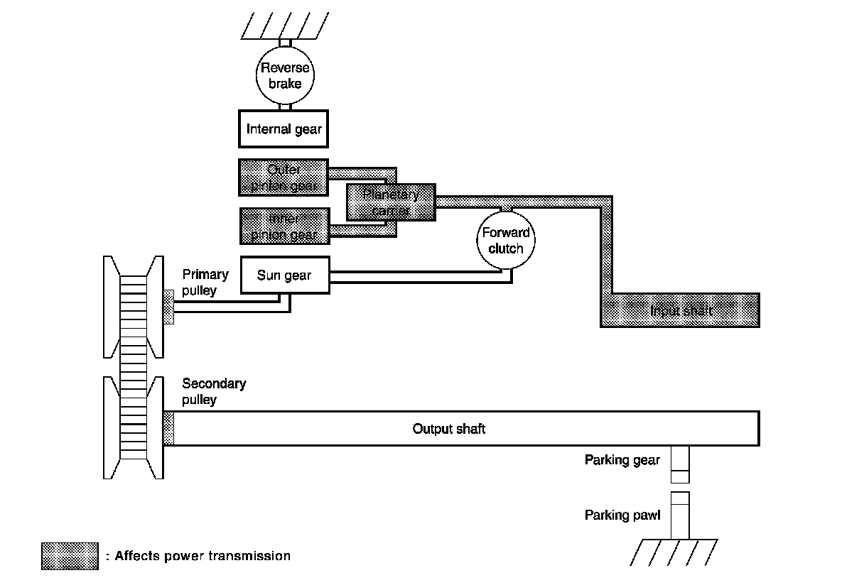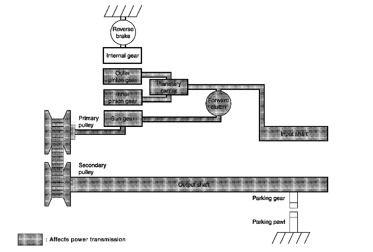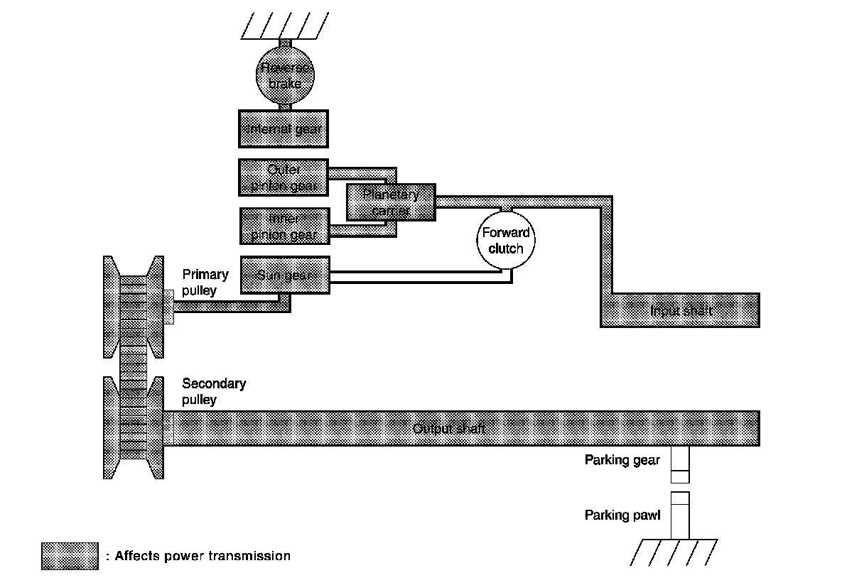 - Driving force from input shaft is not transmitted to primary pulley because of idling caused by poor engagement of forward clutch and reverse brake.