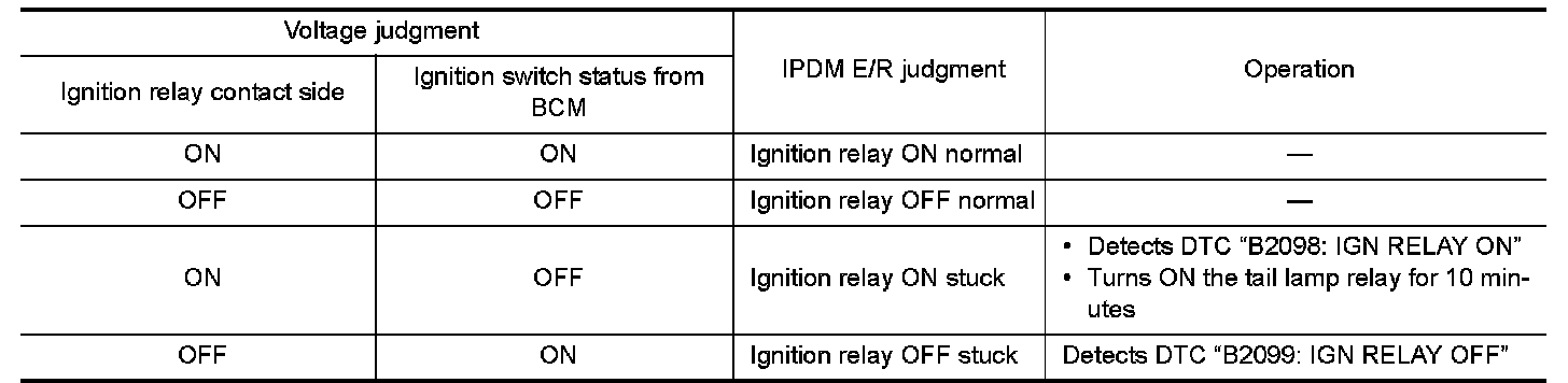 - IPDM E/R judges the ignition relay error if the voltage differs between the contact circuit and the ignition switch status from BCM via CAN communication.