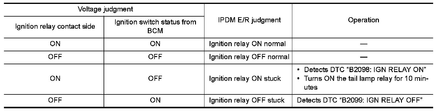 - IPDM E/R judges the ignition relay error if the voltage differs between the contact circuit and the ignition switch status from BCM via CAN communication.