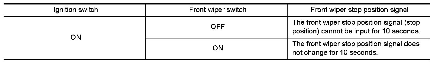 When a front wiper stop position signal is in the conditions listed below, IPDM E/R stops power supply to wiper after repeating a front wiper 10 seconds activation and 20 seconds stop five times.