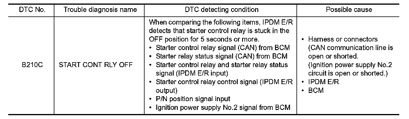 - When IPDM E/R power supply voltage is low (Approx. 7 - 8 V for about 1 second), the DTC B210C may be detected.