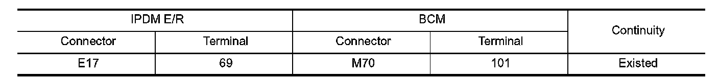 2.Check continuity between IPDM E/R harness connector and BCM harness connector.