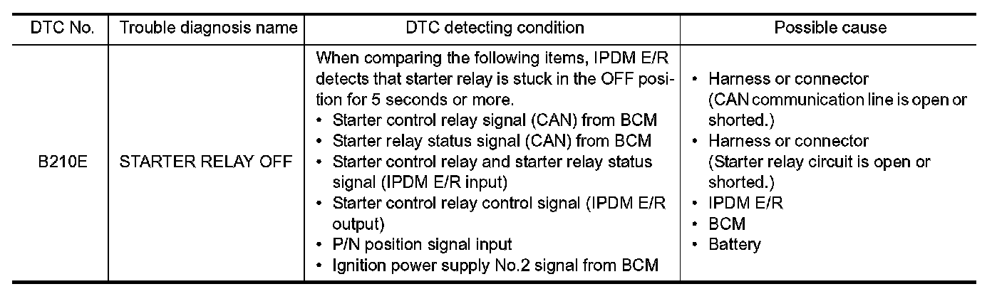 - When IPDM E/R power supply voltage is low (Approx. 7 - 8 V for about 1 second), the DTC B210E may be detected.