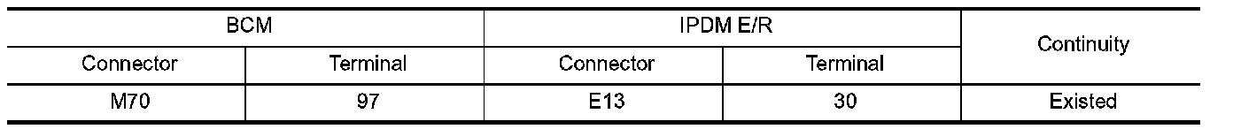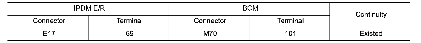 4.Check continuity between BCM harness connector and IPDM E/R harness connector.