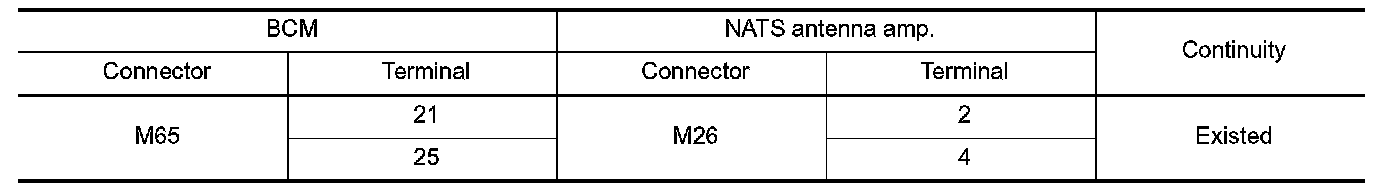 2.Check continuity between BCM harness connector and NATS antenna amp. harness connector.