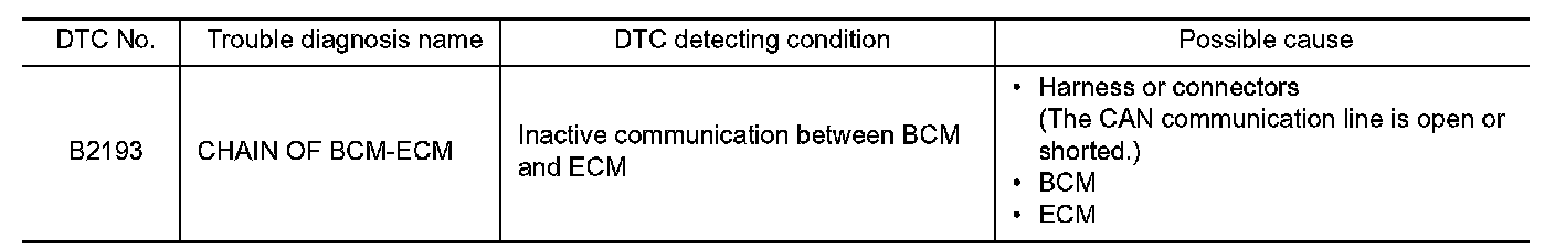 - If DTC B2193 is displayed with DTC U1000, first perform the trouble diagnosis for DTC U1000. Refer to