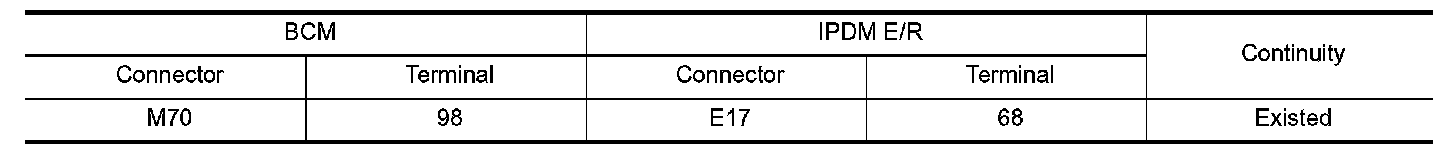 3.Check continuity between BCM harness connector and IPDM E/R harness connector.