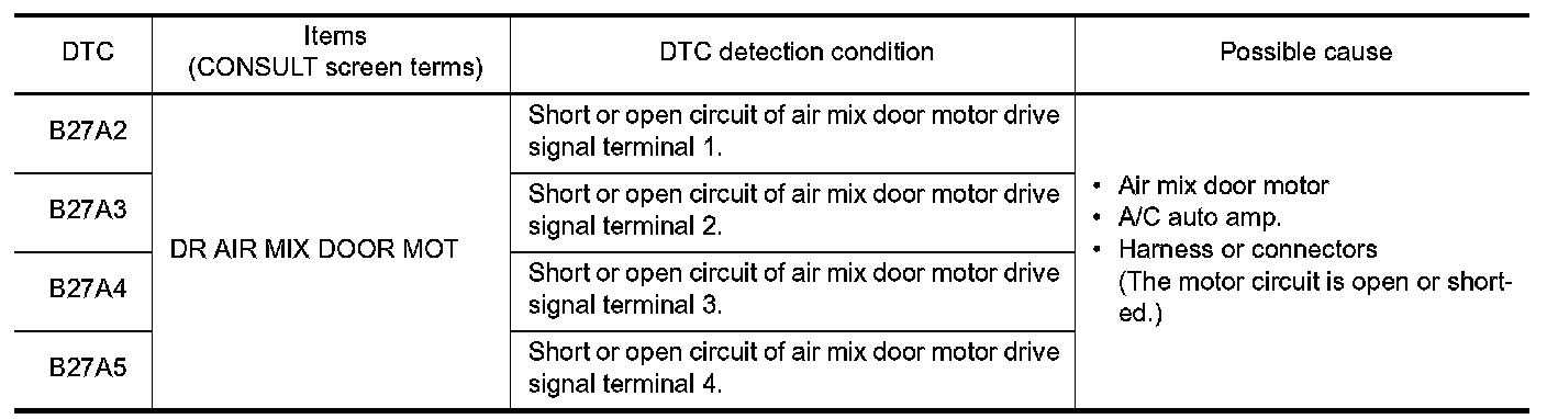 - If air mix door motors DTC (B27A2 - B27A5) are detected, there is probably a disconnected connector or an open circuit in air mix door motor drive power supply harness.