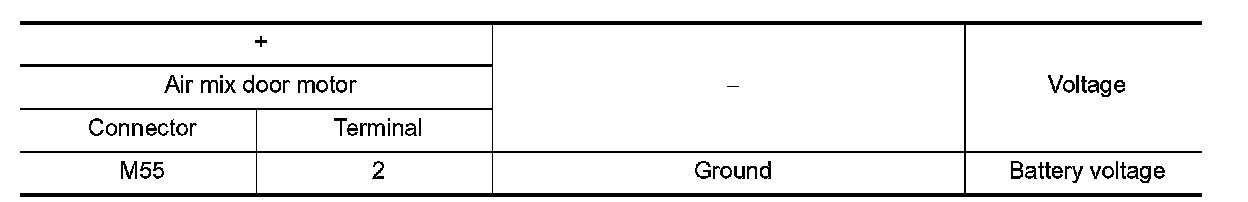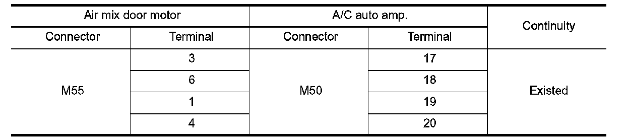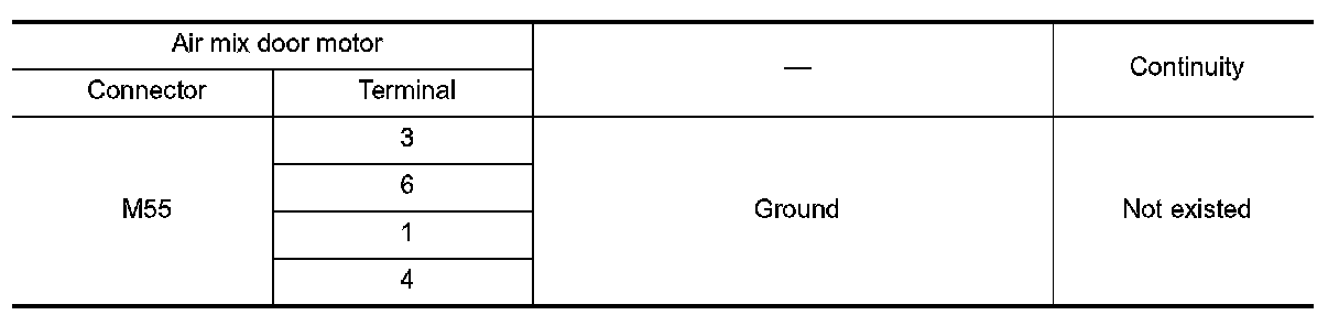 2.Check resistance between air mix door motor terminals. Refer to applicable table for the normal value.