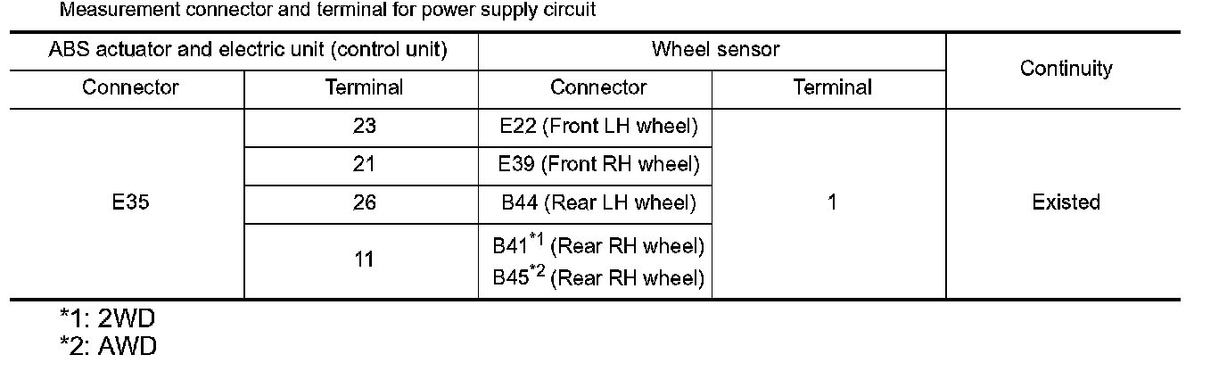 4.Check the continuity between ABS actuator and electric unit (control unit) harness connector and wheel sensor harness connector. (Check the continuity when steering wheel is steered to RH and LH, or center harness in wheel housing is moved.)