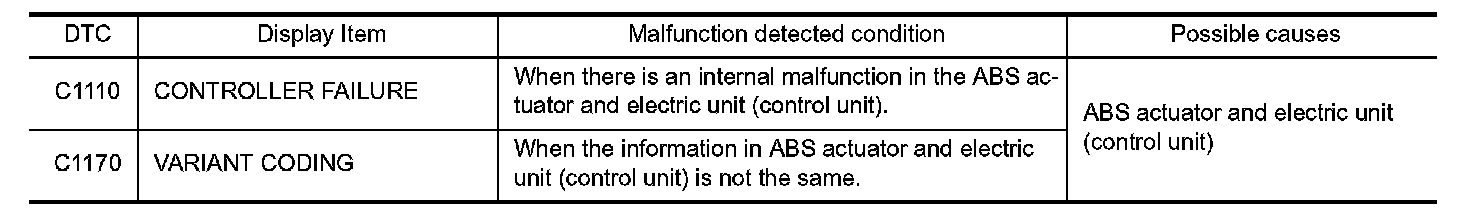 Replace ABS actuator and electric unit (control unit) even if other display than "C1110" or "C1170" is displayed in self-diagnosis for "ABS".