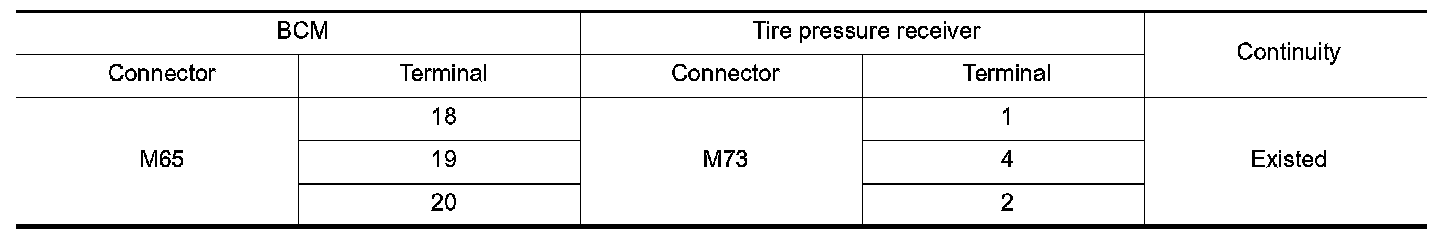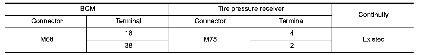 3.Check the continuity between BCM harness connector and tire pressure receiver harness connector.