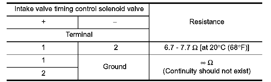 3.Check resistance between intake valve timing control solenoid valve terminals as per the following.