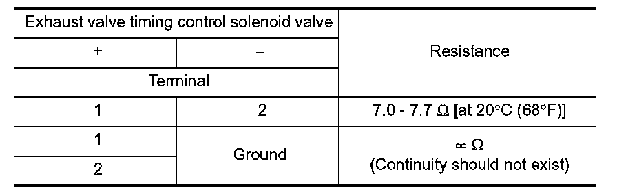 3.Check resistance between exhaust valve timing control solenoid valve terminals as per the following.