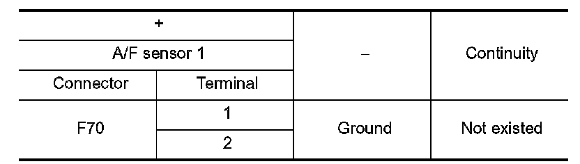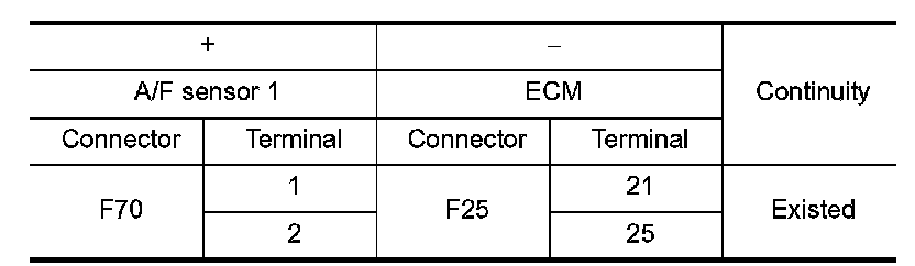 3.Check the continuity between A/F sensor 1 harness connector and ECM harness connector.
