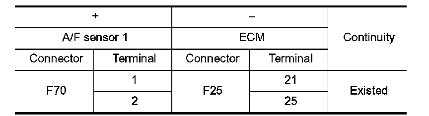 3.Check the continuity between A/F sensor 1 harness connector and ECM harness connector.