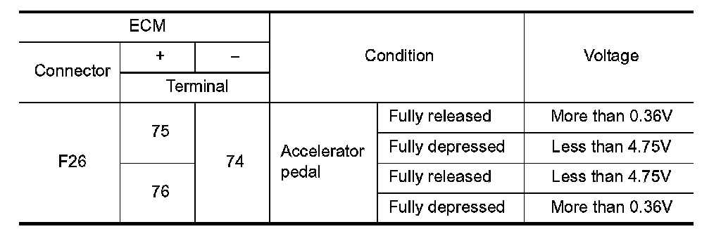 6.Check the voltage between ECM harness connector terminals as per the following conditions.
