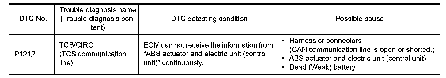 This CAN communication line is used to control the smooth engine operation during the TCS operation. Pulse signals are exchanged between ECM and "ABS actuator and electric unit (control unit)".
