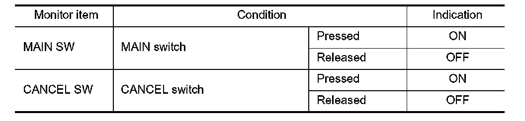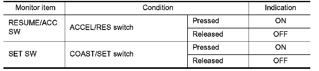 2.Select "CANCEL SW", "RESUME/ACC SW" and "SET SW" in "DATA MONITOR" mode of "ENGINE"