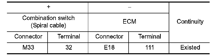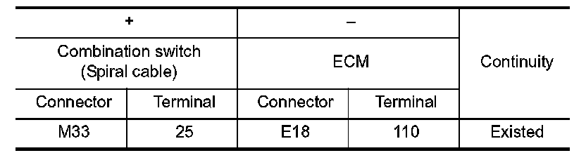 4.Check the continuity between combination switch (spiral cable) and ECM harness connector.