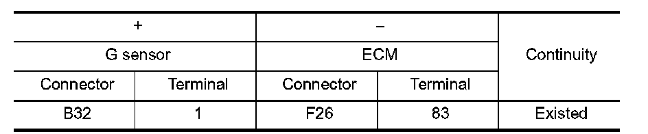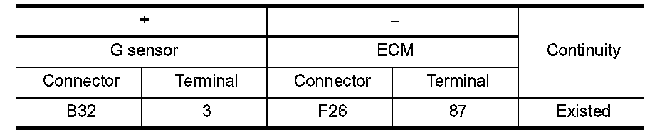 3.Check the continuity between G sensor harness connector and ECM harness connector.