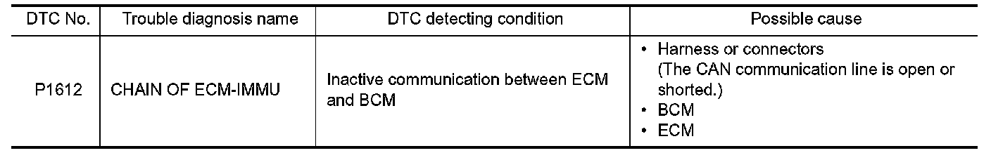 - If DTC P1612 is displayed with DTC U1000 (for BCM), first perform the trouble diagnosis for DTC U1000.