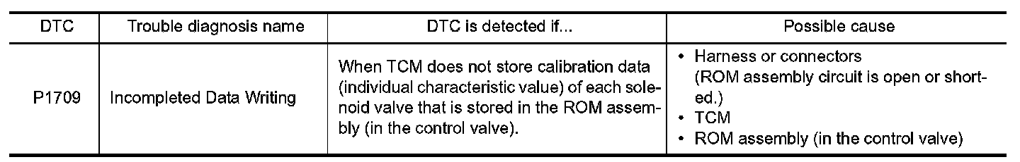 When TCM does not store calibration data (individual characteristic value) of each solenoid valve that is stored in the ROM assembly (in the control valve), a malfunction is detected.