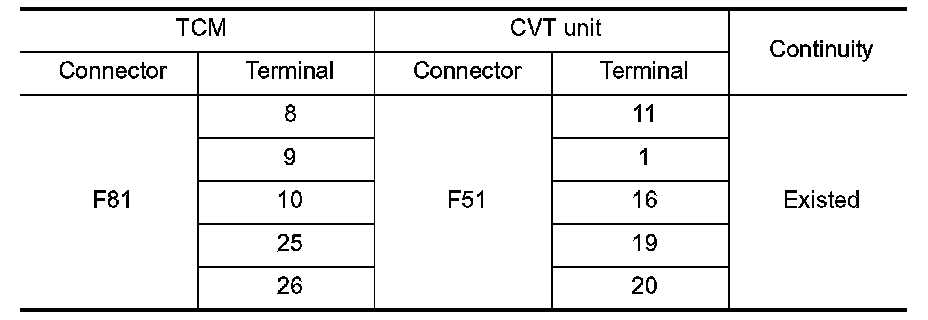 3.Check continuity between TCM vehicle side harness connector terminals and CVT unit vehicle side harness connector terminals.