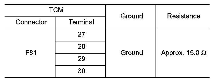 Check resistance between TCM harness connector terminals and ground.