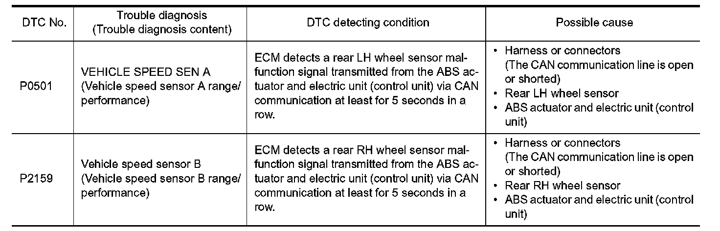 If DTC P0501 or P2159 is displayed with DTC UXXXX, first perform the trouble diagnosis for DTC UXXXX.