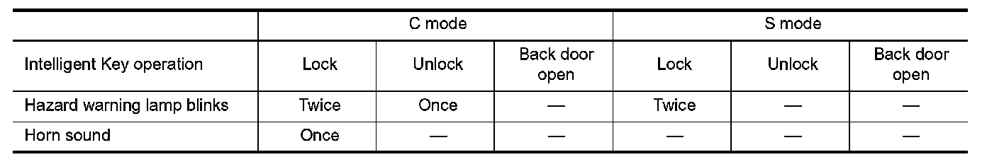 When LOCK and UNLOCK signals are sent from the Intelligent Key for more than 2 seconds at the same time, the hazard and horn reminder mode is changed and hazard warning lamp blinks and horn sounds as per the following items: