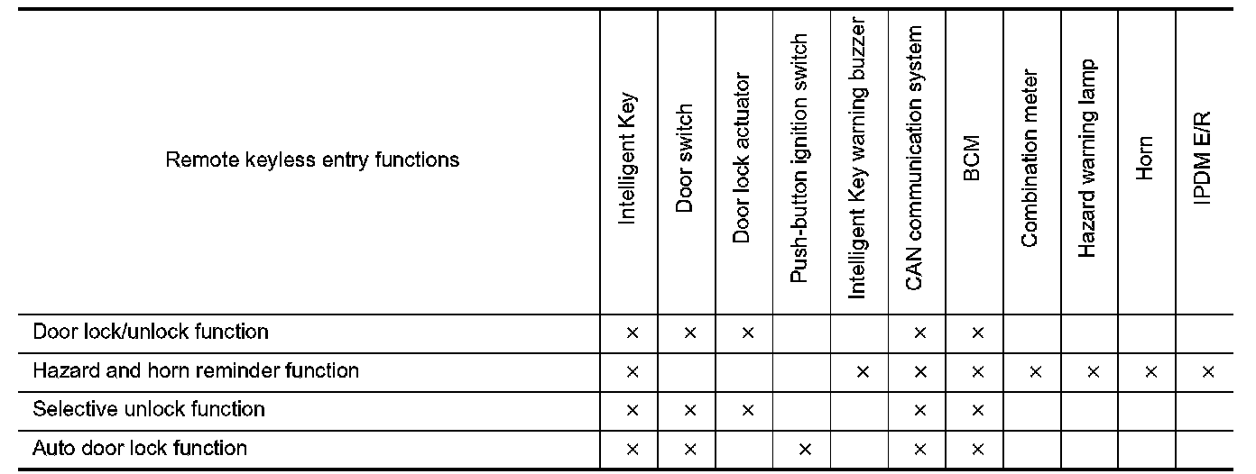 - When BCM receives the door lock/unlock signal, it operates all door lock actuators and the hazard lamp (lock: 2 times, unlock: 1 time) and horn chirp signal to IPDM E/R at the same time as a reminder.