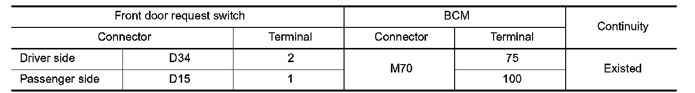 2.Check continuity between malfunctioning front door request switch harness connector and BCM harness connector.