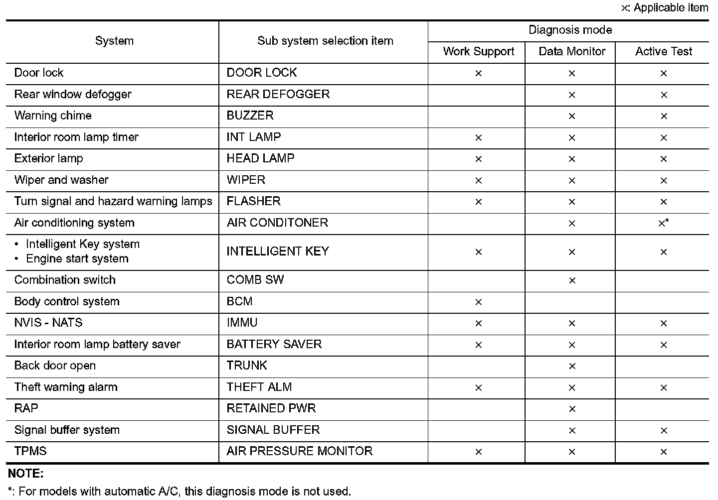 It can perform the diagnosis modes except the following for all sub system selection items.