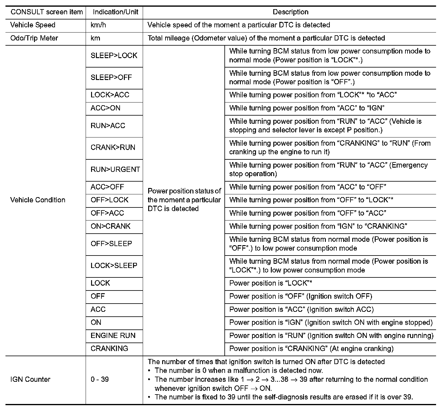 The BCM records the following vehicle condition at the time a particular DTC is detected, and displays on