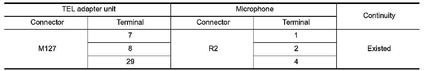 3.Check continuity between TEL adapter unit harness connector and microphone harness connector.