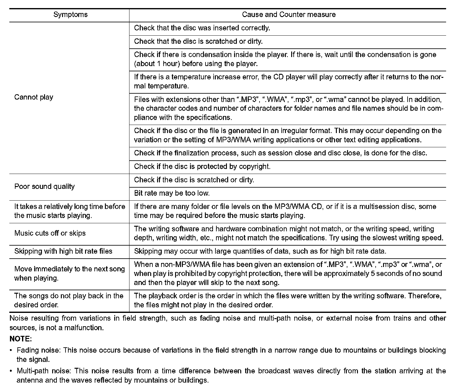- The majority of the audio malfunctions are the result of outside causes (bad CD, electromagnetic interference, etc.). Check the symptoms below to diagnose the malfunction.