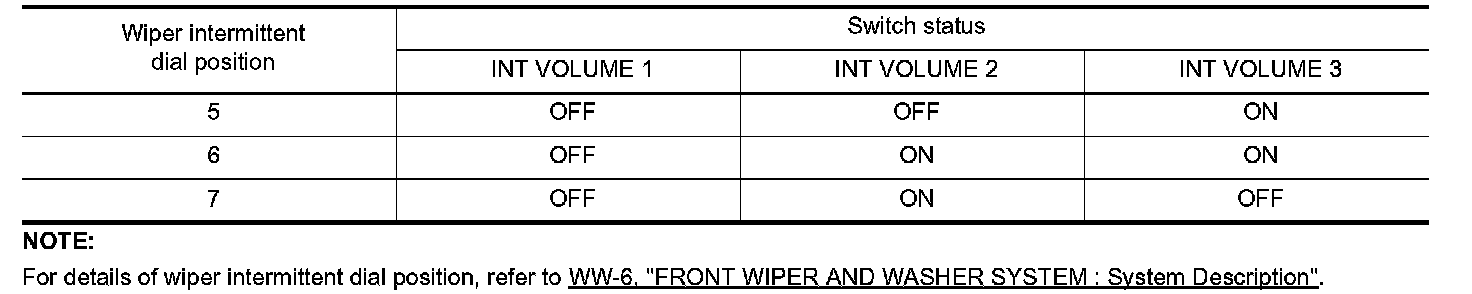 BCM judges the wiper intermittent dial 1 - 7 by the status of INT VOLUME 1, 2 and 3 switches.