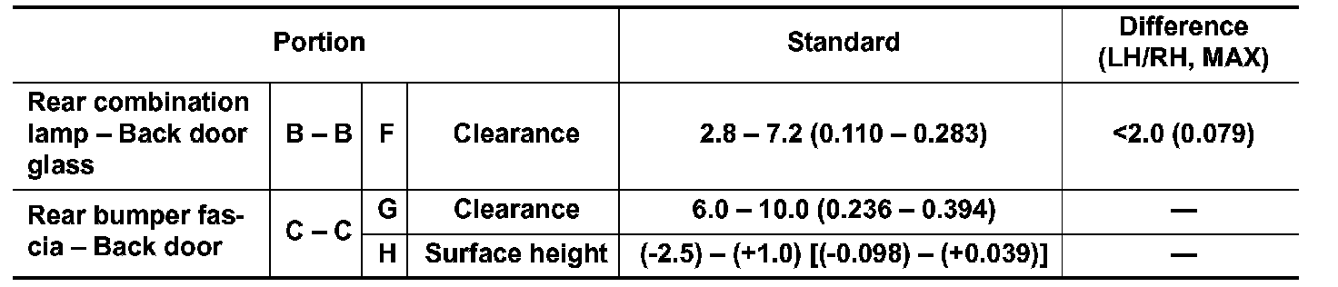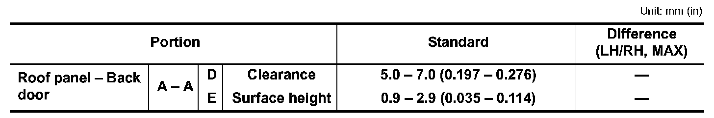 3.Adjust back door using back door striker and back door hinge to the specified value, as shown in the following table.