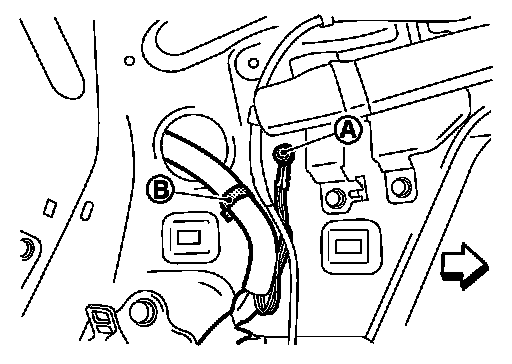 7.Remove ground harness mounting bolt (A) and harness fixing clips (B).